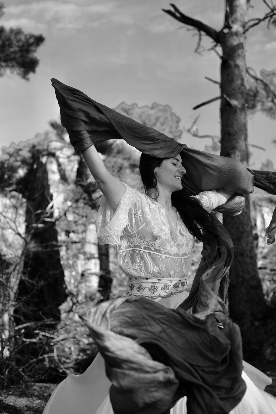 Artiste pluridisciplinaire, Lizzie recherche et crée avec le geste dansé, dessiné et écrit en questionnant la relation des corps à l’environnement. Elle dialogue continuellement avec le pont indissociable entre le dedans et le dehors tissant ainsi des liens entre le réel et l’imaginaire. Elle fonde Beloved Movement en 2023 en concentrant sa recherche autour des notions d’espace individuel et collectif, de temps et des rythmes du vivant. Elle interroge la présence des corps dans l’interdépendance et l’appartenance au vivant ainsi que ses mémoires par la révélation des gestes dans l’instant. Elle explore le geste d’improvisation et la giration faisant dialogue entre la vie et la mort comme une expérience offrant un lieu refuge où l’existence peut être réévaluer et advenir. Elle donne des ateliers, des stages immersifs et crée plusieurs performances. Depuis 2025, elle co-crée avec d’autres artistes à travers des espaces de recherches, d’improvisations , de créations autour de la dynamique des lois et rythmes du vivant, du lien au visible et à l’invisible faisant vivre la vie comme un jeu de transcendance parfois ralenti – parfois rapide et toujours vivifiant et ressourçant où tout par de soi, de la relation à son environnement et se vibre à l’universel.
