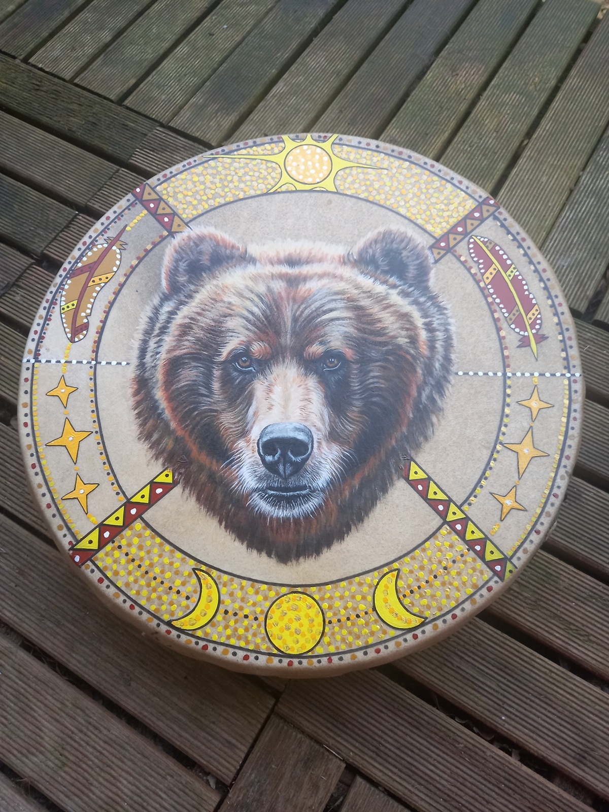 « Lorsque je travaille avec le tambour, je suis en connexion avec la peau de l’animal, son esprit et ses émotions vécues dans son incarnation par ses mémoires. Il me fait travailler par la complexité des difficultés auxquels il va me soumettre. C’est un partenariat qui ne peut s’accomplir que dans la reconnaissance du vivant visible et invisible, le respect mutuel, la patience, la douceur et la confiance. »