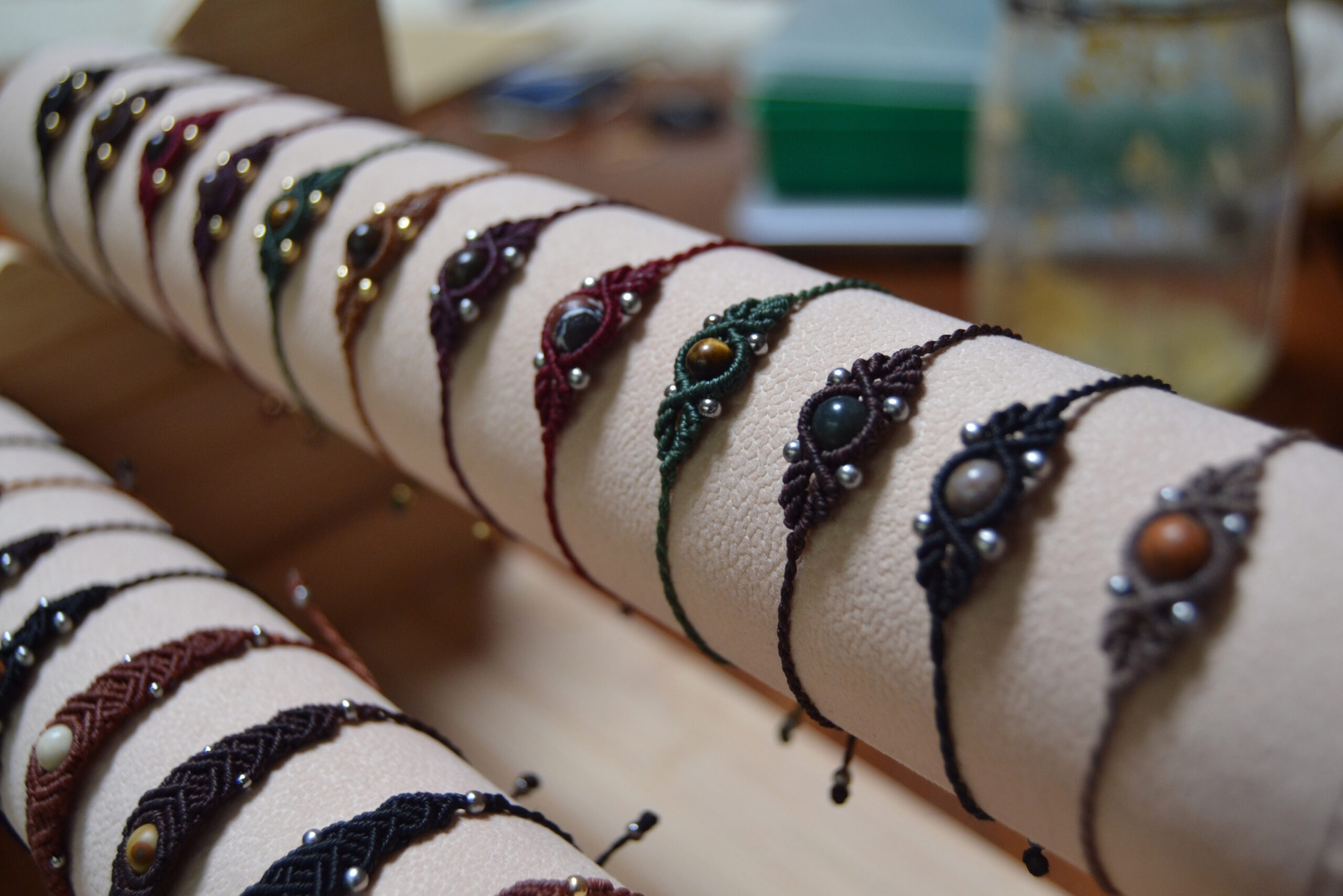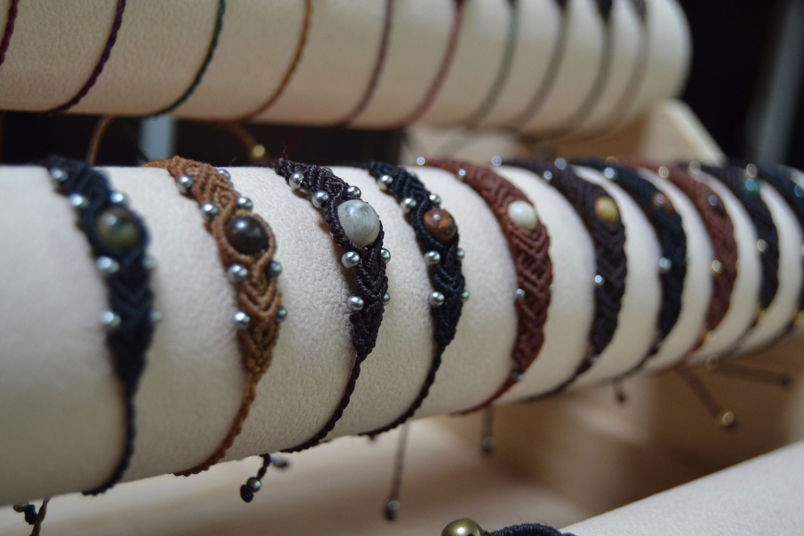 Je réalise également des bijoux en micro macramé, des créations